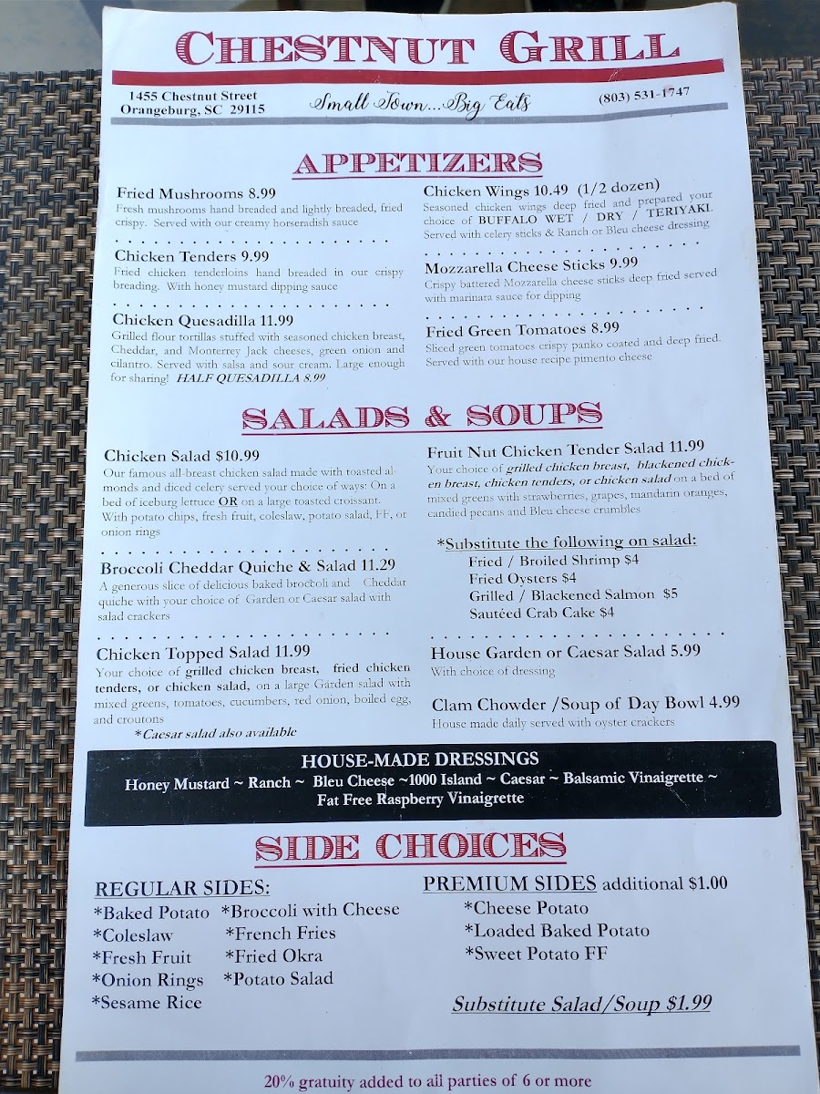 Welcome to Chestnut Grill, a hidden gem located at 1455 Chestnut St, Orangeburg, SC. This charming eatery offers an enticing menu that caters to various palates, ensuring a delightful dining experience. Start your meal with Loaded Fries for just $7.95, or dive into the juicy Cajun Shrimp for $13.95, perfectly breaded and fried to crispy perfection. The hearty Salad Sampler, featuring chicken salads with a twist, promises freshness and flavor.